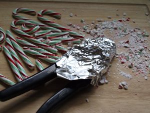 Back inside the house, I washed the wrench in soapy water and outfitted it in a condom made from tin foil. I started smashing the candy canes with the sanitized wrench. Sticky little bits of candy cane dust bounced off the board with each whack. None of the recipes I read warned me about this. I tried to find the exact pressure needed to smash the candy canes without creating further loss of product, hoping to raise my candy-to-effort ratio. Then I discovered that the handle of my knife did a better job at crushing, so I abandoned the wrench, wrapped my knife in a towel, and carefully – oh, so carefully – started bashing the remaining candy canes, all the while praying to the kitchen muses to protect me from unwanted loss of small limbs.